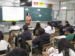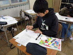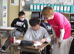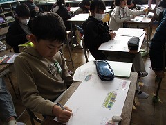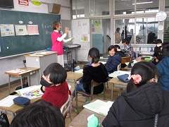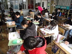 突然「訓練、地震がきました。」の放送が流されました。運動場で遊んでいた子や大縄跳びの練習をしていた子たちは、急いで運動場の中央に集まっていきます。職員室にいた先生たちも、事務机などの下に入って次の放送を待ち、まずは一時避難を終えました。
