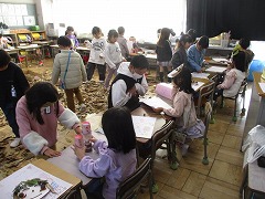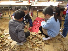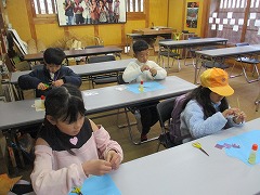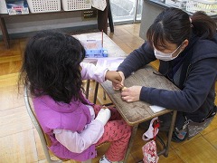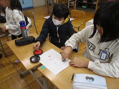 始めに鉛筆で下描きをしました。作業しやすい星やハートなどの模様を決め、鉛筆で描いていきます。イモの水分も少なくなっていて、どの子もすぐにできあがりました。次は、くぎを使って線彫りをしました。くぎの先を点々のようにつないで刺して掘り進めた子は、完成して試し押しをしたところ、数珠のようになっていました。思っていた印影になっておらず、改めて線をなぞって修正し、再度判を押して納得の笑顔となりました。ハンコ作りを楽しむことができました。