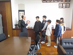 愛西市社会福祉協議会の方が永和小に来られました。今日は、11月に児童会が集めた赤い羽根共同募金を担当の方へお渡しします。