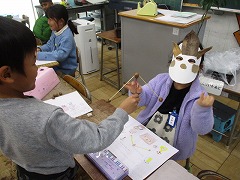 1-1では、生活科でおもちゃランドを行いました。子どもたちは、ドングリや松ぼっくりなどを使ったドングリマラカス、ドングリやじろべえ、ドングリごま、松ぼっくりけん玉、ドングリパチンコなどのおもちゃを作り、職員室にいる先生たちを招待しました。