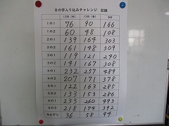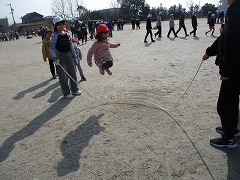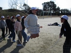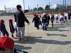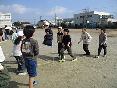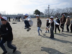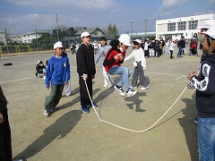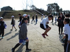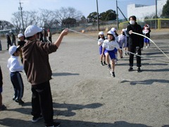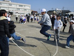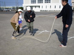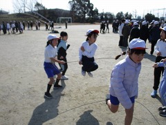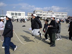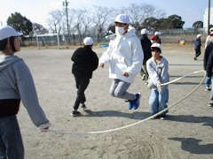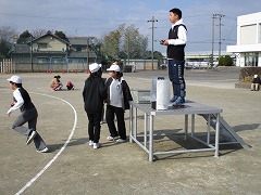 突然「訓練、地震がきました。」の放送が流されました。運動場で遊んでいた子や大縄跳びの練習をしていた子たちは、急いで運動場の中央に集まっていきます。職員室にいた先生たちも、事務机などの下に入って次の放送を待ち、まずは一時避難を終えました。