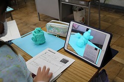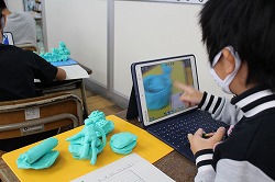 3年生は図工の授業で活用していました。粘土で立体作品を作った後、学習用タブレット端末で自分の作品を撮り、ロイロノートでクラスのみんなと共有して鑑賞しました。また、自分の作品紹介用のプリントも、画像として一緒に取り込んで共有することで、ポイントを絞って鑑賞することができました。必要な画像をアップにしたり、ロイロノートに送ったりと、子どもたちはタブレット端末の使い方を柔軟に吸収して、みるみる使いこなしています。