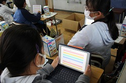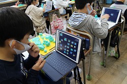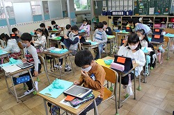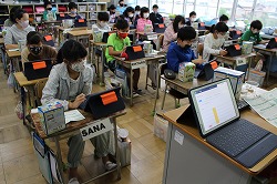 永和小学校に一人一台の学習用タブレット端末が導入され、今年度から本格的に授業での活用が進んでいます。パスワードを設定したり写真を撮ったりと、4月から少しずつタブレット端末を使用して、段階的に授業をしてきました。操作にも徐々に慣れてきて、今ではタブレット端末の活用が学習の一部として定着してきており、授業の幅を広げているようです。