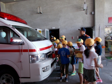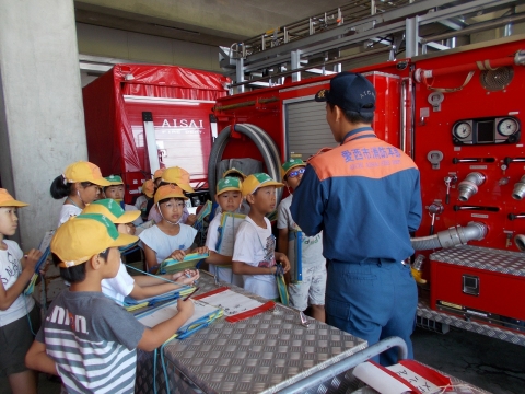 4年生の社会で、消防署の仕事について学習しています。その学習の1つとして、4年生みんなが消防署の見学へ出かけました。