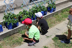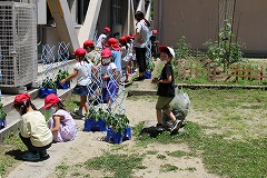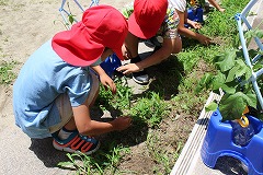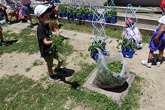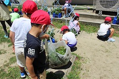 今日はアサガオの植木鉢の周りに生えている草を抜きました。まだ草が小さいのですぐに抜くことができましたが、植木鉢の中にも草が生えており、アサガオが元気に育つように、子どもたちは熱心に草抜きをしていました。