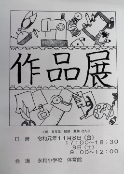 令和最初の作品展が、明日の夜と明後日の午前に開催されます。永和小の体育館が「美術館」となり、自分の思いを込めて、一生懸命作成した全校児童の作品が飾られています。