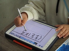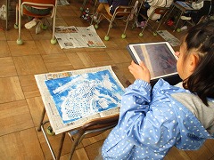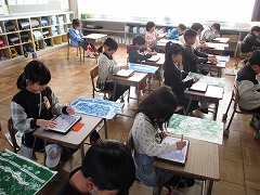 データ提出による紙版画のまとめを行っていました。データ提出も色々なやり方があり、紙に書いたものを提出することもあれば、データ配付されたプリントに文章を入力して提出する場合もあります。子どもたちがやったのは、紙データにタッチペンで直接書き込んでから提出する形でした。2年生ですが、何度も経験しているそうなので、先生の簡単な説明の後は、各自でスムーズに書き込みを行うことができていました。横に置いた自分の作品を見て、頑張りを思い出しながら振り返ることができました。