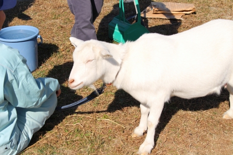 体育館の南側に、ヤギやウサギ、イヌなどの動物たちがやってきました。永和小が動物園になった?! 佐屋高校の先生方と生徒のみなさんによる移動動物園です。1年生の生活科の授業として行われました。