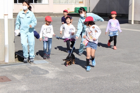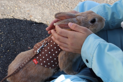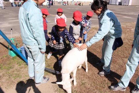 グループごとに分かれて、お兄さんやお姉さんに手伝ってもらい、動物たちを抱っこしたり、なでたりしていました。中には、動物が苦手な児童もいましたが、恐る恐る近づき、少しだけさわることができたようでした。