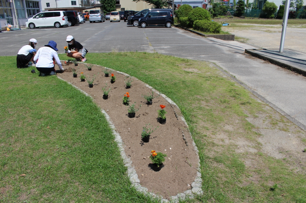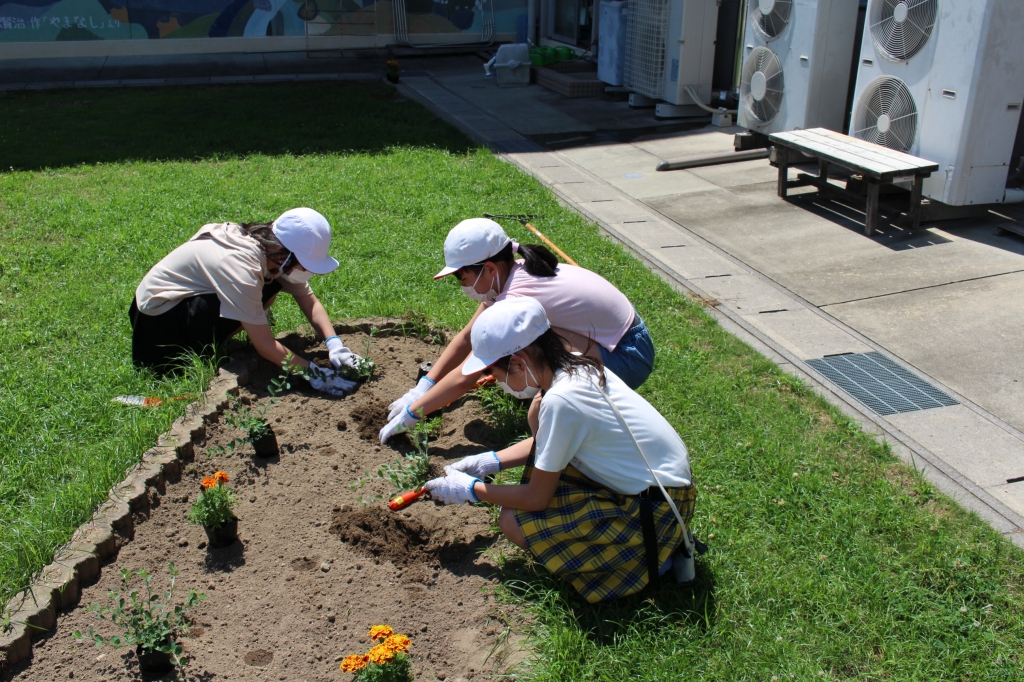 今日は、清掃の時間に、6年生の児童数名に手伝ってもらい、アメリカンブルーとマリーゴールドの苗を植えました。苗をポットから出し、一つ一つ丁寧に土をほぐして植えることができました。きれいに咲いてくれるといいな。