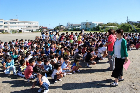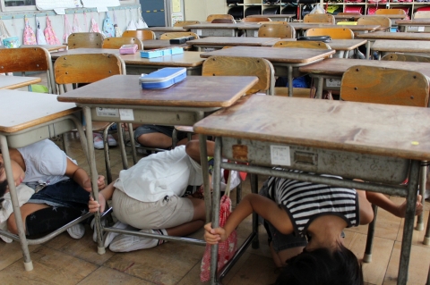 朝の会が終わると、放送からアラーム音とともに、「緊急地震速報。強い揺れに警戒してください・・・」と流れ、全校一斉に机の下にもぐり、自分の身を守りました。数分間、机の下でじっとしていると、今度は地震による火災が発生したことを告げる放送が入り、今度は一斉に運動場へ避難しました。煙を吸わないようにハンカチなどで口を覆い、みんな速やかに校舎から外へ避難しました。およそ5分ぐらいで運動場への避難が完了しました。