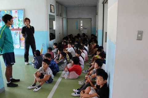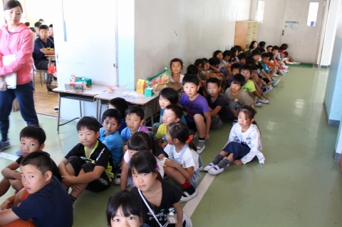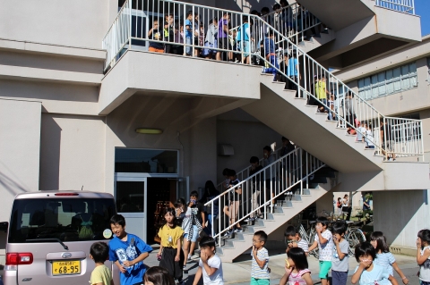 運動場へ集まり、全員の避難を確認した後、今度は津波警報が発令されたことを想定し、校舎3階へ避難する訓練を行いました。みんな慌てずに、先生の指示をしっかり聞き、順序よく3階へ避難しました。校舎3階の教室や廊下に集まり、津波からも身を守ることを体験しました。