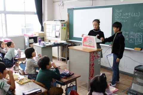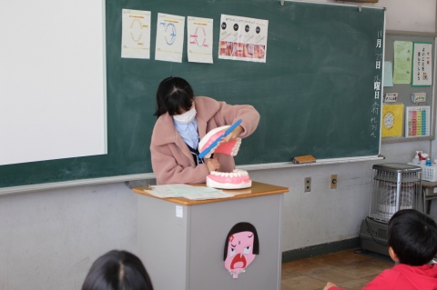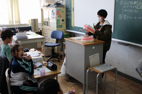 保健委員会が企画し、取り組んでいる「歯みがきプロジェクト」が、今週行われてます。給食を食べた後、毎日行っている歯みがきの時間を利用し、正しいみがき方を大きな口の模型と大きな歯ブラシを使って見本を見せたり、歯のクイズや紙芝居をしたりして、歯をみがくことの大切さを保健委員が一生懸命伝えています。