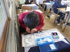 手縫いをする子たちは、しつけ縫いをしていました。エプロンの脇の三つ折りが崩れないように大きな縫い目で仮止めします。「こんなになっちゃった・・・。」とエプロンを見せてくる男の子。縫い目が1つだけ2㎜くらいになっていますが、先生から「しつけだから大丈夫!」と励まされ、元気を取り戻していました。ミシン縫いの子は、脇のしつけ縫いに重ならないように本縫いをしていました。三つ折りをしっかり固定するには、縫う場所が折り目の中央ではなく、少し内側に寄せなければなりません。しかし、ミシンは自動で縫い進めていきます。はじめはちょうどよい場所で縫っていても、徐々にしつけ糸に近づいてしまう子もいました。何とか布を引っ張って、空縫いやしつけ糸との重ね縫いは避けることができました。