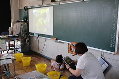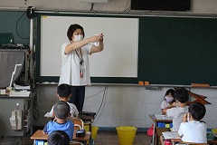 「お家でぞうきんを使ったことがある人?」「はーい」。6~7人の子が手をあげました。最近では便利なお掃除道具があるため、家でぞうきんを使うことが少なくなりました。そんな中、今日は1年生の子たちが、ぞうきんの使い方を教わりました。
