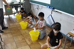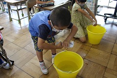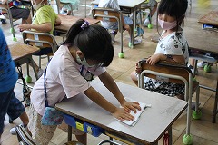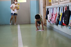 ぞうきんの絞り方や洗い方、廊下や机の上のぞうきんのかけ方など、一つ一つ説明を受けました。ぞうきんを半分にたたんで、両手でぞうきんをひねる。ぞうきんの端の方も、水が出てこないようにしっかりとしぼる。それぞれのポイントをおさえながら、ぞうきんを絞りました。その後は、机の上を拭いたり、廊下のぞうきんがけをしたりしました。「足がいたい」と太ももをおさえている子もいました。どの子も一生懸命ぞうきんがけをしており、ろうかもピッカピカになりました。