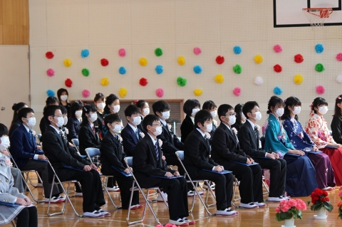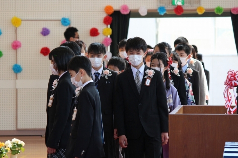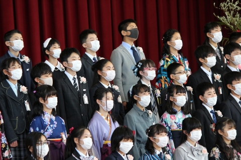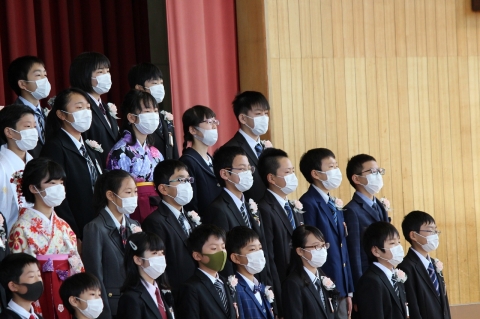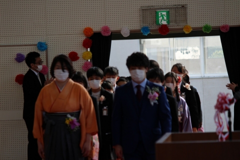 そして、卒業式の最後は、卒業生による「別れの歌」。「絆」「旅立ちの日に」「校歌」と3曲を続けて歌いました。練習ができず、ほとんどみんなで合わすことができませんでしたが、卒業生一人一人の強い思いが歌声に込められ、そして、その歌声がひとつとなり、会場にいるすべての人の心へ響き渡りました。在校生のみんなにもその歌声や思いが届いたと思います。