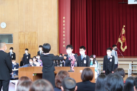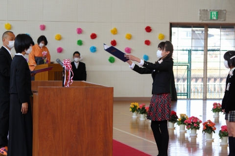 そして、一人一人が卒業証書を受け取る「卒業証書 授与」。受け取る練習をしていないため緊張していた人がたくさんいたと思いますが、みんな堂々とした姿で校長先生から卒業証書を受け取っていました。