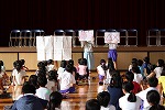 今日、児童会役員選挙が行われました。会長、副会長、書記に立候補した児童が、自分の思いや願いを4・5・6年生の児童に述べました。
