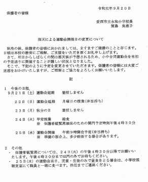 学校メールや永和小学校のホームページ、本日配付のお便りでお伝えしていましたが、小中合同運動会は、9月25日(水)に延期となりました。