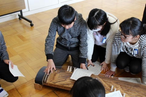6年生は茶道体験に引き続き、日本文化にふれる体験として「琴体験」を行いました。琴の先生の説明を聞いた後、琴爪をつけて、琴を弾く練習をグループごとに行いました。先生も一人一人に付き添い、丁寧に教えていただきました。「さくらさくら」の音色がきれいに響くとみんなで喜んでいました。時間の関係上、曲の最後まで弾く練習ができませんでしたが、練習したところまでの成果をお互いに確認し合いました。琴のすてきな音色が響き渡り、日本文化のよさをみんなで感じていたように思います。