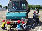「内輪差」は後ろタイヤは前タイヤの内側を通ることを学び、曲がる車の内側には立たないようにする話を聞きました。人形が巻き込まれるのを見ました。