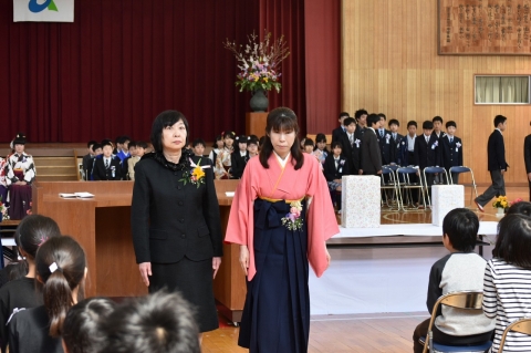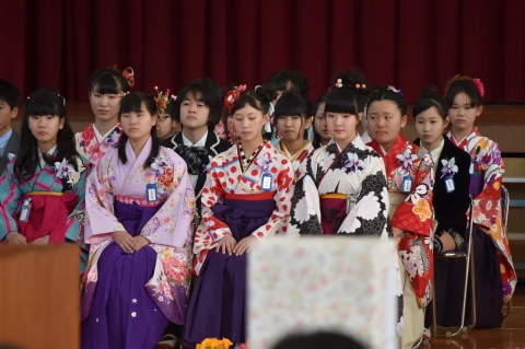 午前9時、「卒業生入場」の声がかかり、舞台から凜々しい姿の卒業生が入場。