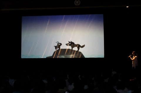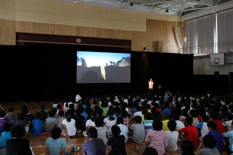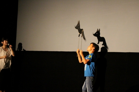 「あらしのよるに」の物語が終わると、影絵教室が行われました。劇団の方が3名の児童を指名し、みんなの前で影絵の人形の動かし方を指導していただきました。 3名みんなが人形を上手に動かし、会場からたくさんの拍手をもらっていました。実際にスクリーンの後ろに行き、3名みんなが影絵の動きにもチャレンジしました。