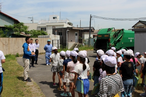 4年生の社会科の授業では、「ごみのしまつと活用」という単元を学習しています。その学習の一つとして、今日の午後、ごみ収集車の見学を4年生みんなで行いました。
