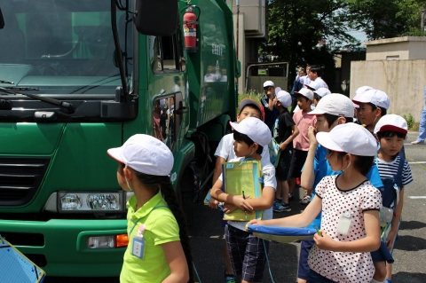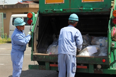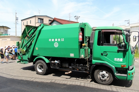 まず、パッカー車と呼ばれるごみ収集車を見学し、その後、ごみ回収作業の方法を実演とともに教えていただきました。