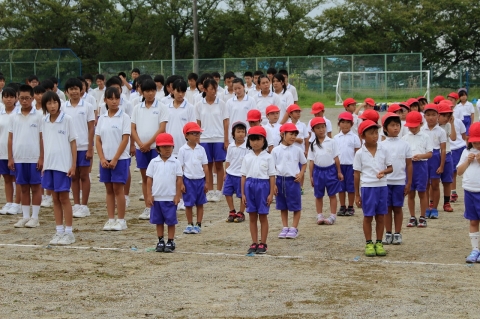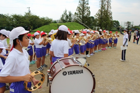 今日は、中学生が小学校へ来て、小中合同運動会の全体練習が行われました。運動会に参加する小中学生全員が運動場に集まり、本番さながらの練習となりました。中学生の姿を手本に低学年のみんなもビシッとした態度で開会式や閉会式の練習を行い、運動会に向けてよい練習になったと思います。入場行進や国旗掲揚などでは金管バンド部の演奏で行い、これまでの練習の成果を発揮していました。
