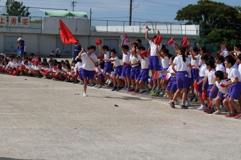 白組も赤組も、リーダーたちの熱のこもったかけ声に、みんなの声の大きさも動きもよくなっていき、応援の完成度がかなり高まりました。何度も通し練習をし、リーダーたちが話し合い、不十分なところをどんどん練習していました。小学生のみんなも大きな声を出し、応援をしっかり盛り上げていました。