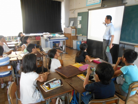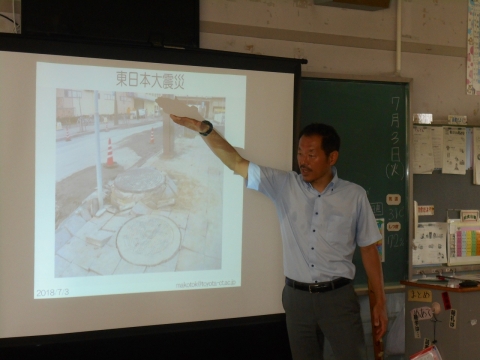 愛西市近郊は、土地が低く、昔から水害の被害に悩まされた土地です。現在は、洪水などの災害はほとんどありませんが、大きな地震が起きた場合、地面の液状化現象が起こる危険性があります。そんな愛西市の状況を踏まえて、豊田高専の小林先生を講師に、4年生の子どもたちが防災に関わる授業に取り組みました。現在の愛西市の土地の様子を教えてもらったり、液状化現象の仕組みをペットボトルの中で再現した地面で確認したりしました。最後に大きな地震が起こったときでも、地域の方たちと協力して避難できるよう、日頃から近所の人とコミュニケーションをとることの大切さを学びました。今日の授業をいつ起こるかわからない災害に、学校でも地域でも生かしてほしいと思います。