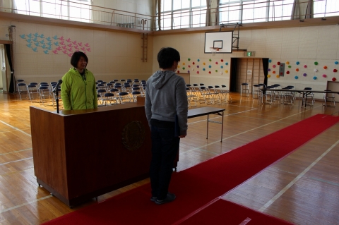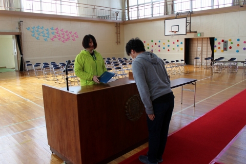 (4) 演台のぎりぎりまで移動し、校長先生と目を合わせ、礼をします。6年1組の1番の児童だけ、校長先生が卒業証書の全文を読みます。