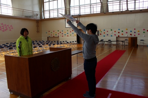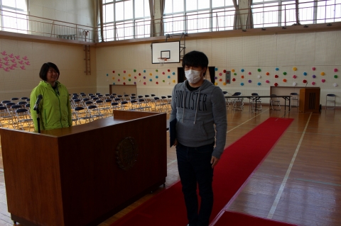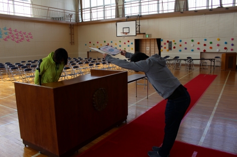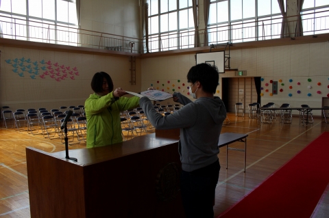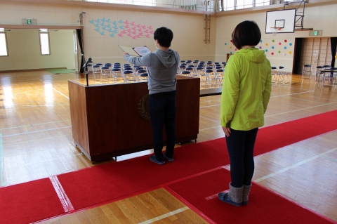 (1) 司会の先生が、「卒業証書授与」と言うと、校長先生が、演台へ移動し、準備をします。