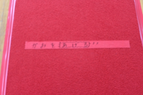 (8) 礼が終わったら、卒業証書をとじて、右側の腰のあたりにおさめます。そして、1組の児童は「左側」を向いて、2組の児童は「右側」を向いて、赤いじゅうたんの上を通って、自分の席へもどります。その後、卒業証書は、自分のひざの上で持っています。
