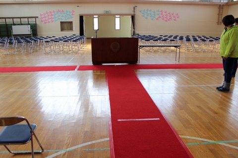 ※ 2番目の児童からは、下の写真のように、卒業証書をもらっている人の少し後ろにあるマークで待ちます。その場所で、自分の名前を呼ばれたら、「はい」と返事をし、上記の(4)のように、演台のぎりぎりまで前に出て、礼をします。