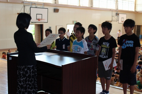 月曜日の朝礼で、選手と参加者全員のがんばりをたたえるとともに、表彰式が行われました。陸上競技会の主な結果は以下の通りです。