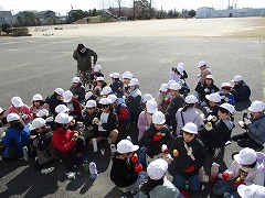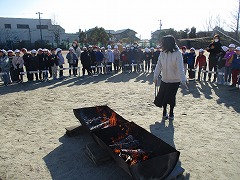 先生に焼いてもらうので、まずは、焼き窯に火をつけ、イモを焼く準備をいているところを見学しました。大きく燃えている炎に笑顔がこぼれます。「よろしくお願いします!」全員でお願いのあいさつをした後は、運動場へ冬探しに行きました。次に、焼き芋を窯に入れるところを見学しました。「うわ~!」「(火に入れられるイモを見て)あれ、僕のだ!」子どもたちの期待も高まります。