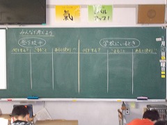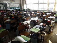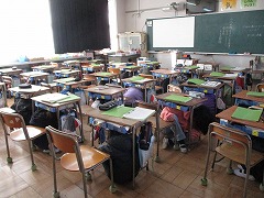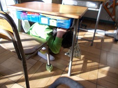 今日は避難訓練がありました。1時間目が始まるとすぐに緊急地震速報のサイレンが放送され、すかさず子どもたちは机の下に避難をしました。「小さな声も出さない!」と先生。緊急時を想定した訓練なので、口調も厳しくなります。1分ほど静かに避難をすると、放送に合わせて席に戻りました。その後、授業中以外に地震が起きたことを想定して考えました。教室以外で地震が起きたら?そこにはどんな危険がある?高学年では、その時にどうしたらいいか?などを、各学級で話し合いました。