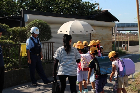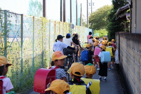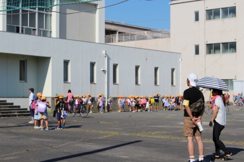体育館前から低学年の児童の大きなあいさつの声が聞こえました。いつもは一部の先生が付き添い、下校がスタートしますが、今日は、PTAの校外指導委員さんやお巡りさんも一緒でした。