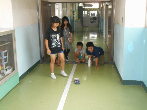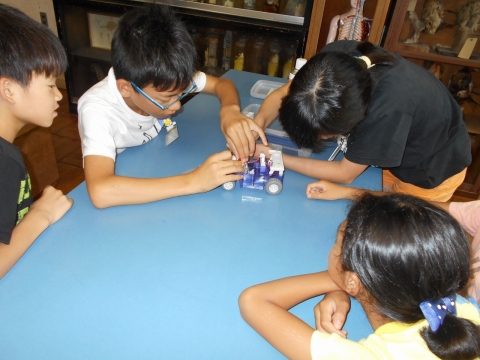 最初に水素と酸素をもとにした燃料電池について説明を聞きました。その後、模型の自動車に燃料電池を設置し、走るかどうかを確認する実習を行いました。どのグループもみんなで協力し、自動車のセッティングをしていました。廊下で走らせてみると、どのグループもうまく動き、みんな喜んでいました。燃料電池の可能性を実感した授業だったと思います。