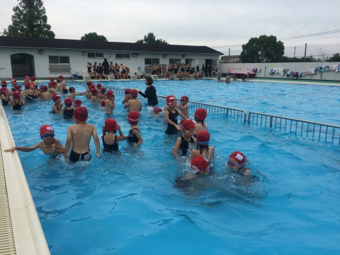 6月14日(木)にプール開きをしましたが、梅雨のせいで、思うように水泳の授業が行うことができませんでした。しかし、梅雨の晴れ間とまではいきませんでしたが、1年生のみんなが初めて小学校のプールで水泳の授業を行いました。少し冷たく感じるプールの水でしたが、しっかり体に水をかけ、1年生のみんなは元気にプールの中へ入りました。プールの中を歩いて、水の深さやプールの中の様子をまずは体感しました。そして、水の中へ潜ったり、水中じゃんけんをしたり、初めてのプールを楽しみました。これからもどんどんプールに慣れ、泳ぐ練習をがんばっていきましょう。