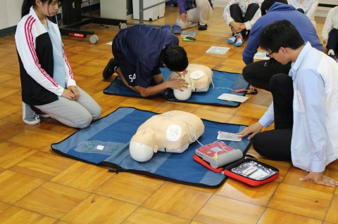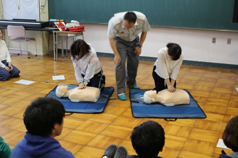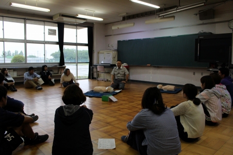 子どもたちの下校後に先生たちも授業を受けました。プール開きが近いこともあり、消防署の方を講師に、救命救急法を学ぶ講習会が行われました。心肺停止などで倒れている人を見つけた場合の対処の仕方を教えていただき、実習しました。特に胸骨圧迫や人工呼吸、AEDの使い方を実習しました。6月中旬から行われるプール指導や今後の学校生活で、もしかのときにどの先生も対処できるようしっかりと勉強しました。