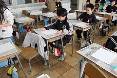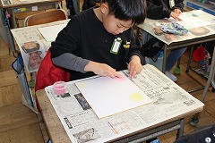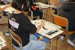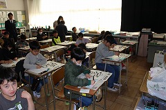 色紙に、優しい色で背景を描いた後で、お手本のデザインをもとに数枚練習しました。「ドキドキして描けない・・・。」「うまくできるかなあ?」のつぶやきも聞こえてきて、緊張感も大きかったようです。意を決して書き上げると、講師の先生から「いいねえ!」「いままでの下書きの中で一番いいんじゃない?」などのお褒めの言葉をたくさんいただいていました。市長さんたちも教室内を回り、笑顔で子どもたちの作品を見たり声をかけたりしていました。さあ、清書です。上手にかけて満足そうに笑っている子、文字が思っていたよりも大きくなって、講師の先生と相談して構図を変えた子、お客さまに作品を見せに行く子など様々でしたが、最後はどの子も満足そうな顔をしていました。お疲れさまでした!