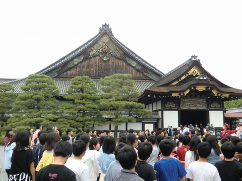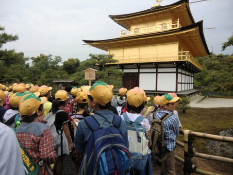 修学旅行2日目。天気は雨の予報でしたが、起床の時間ではまだ曇り空。雨が降らないよう祈りながら朝食をいただきました。2日目の最初は金閣寺の見学からでした。曇り空でも金色に輝く金閣寺を見て、みんな驚きの顔でした。金閣寺の後は、二条城の見学をしました。うぐいす張りの廊下を歩き、実際に音が鳴ることを体感しました。最後にはうぐいす張りの仕組みを床裏を見ながら教えてもらう場面もありました。修学旅行の最終見学場所は、銀閣寺でした。6年生みんなの心がけがよく、2日間傘をささずに見学をすることができ、銀閣寺の見学が終わるとともに雨が降ってきました。学校へ戻り、体育館で解散式を行い、無事に修学旅行を終えることができました。「百聞は一見にしかず」という言葉の通り、6年生にとって素晴らしい経験と学習ができた2日間であったと思います。