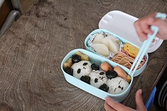 お弁当タイムの様子です。スヌーピーやパンダ、ピカチュウやマイクラ、電車のおにぎりや唐揚げ弁当など、大好きなキャラや物がお弁当になっており、どの子も大喜びです。自然と笑顔になりますね♪