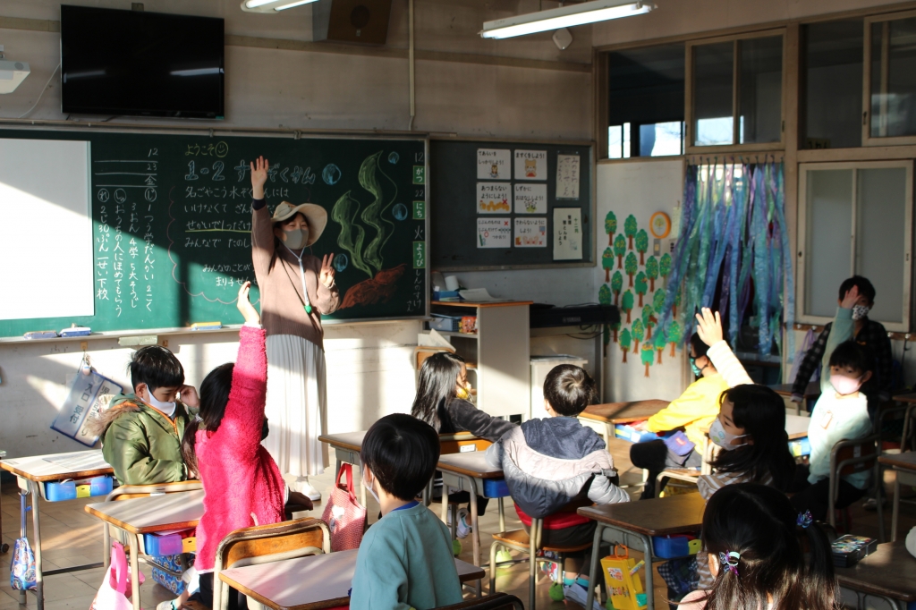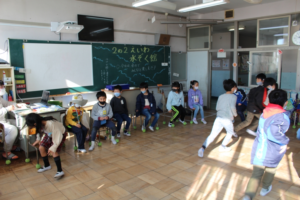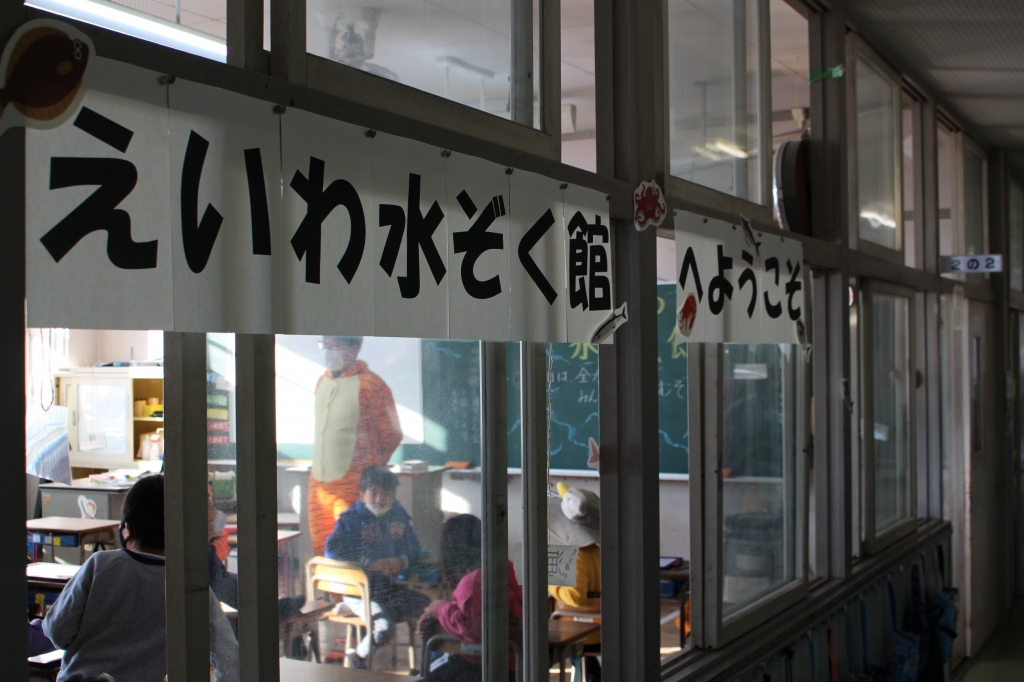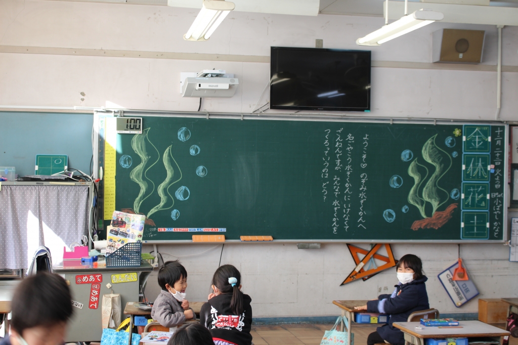 12月22日(火)、1・2年生は合同の社会見学で名古屋港水族館に行く予定でしたが、、、感染症予防のため、残念ながら中止となってしまいました。それでも、担任の先生達が、子ども達のために何かできることはないかと考え、、本日限定、『永和小水族館』が開館しました。