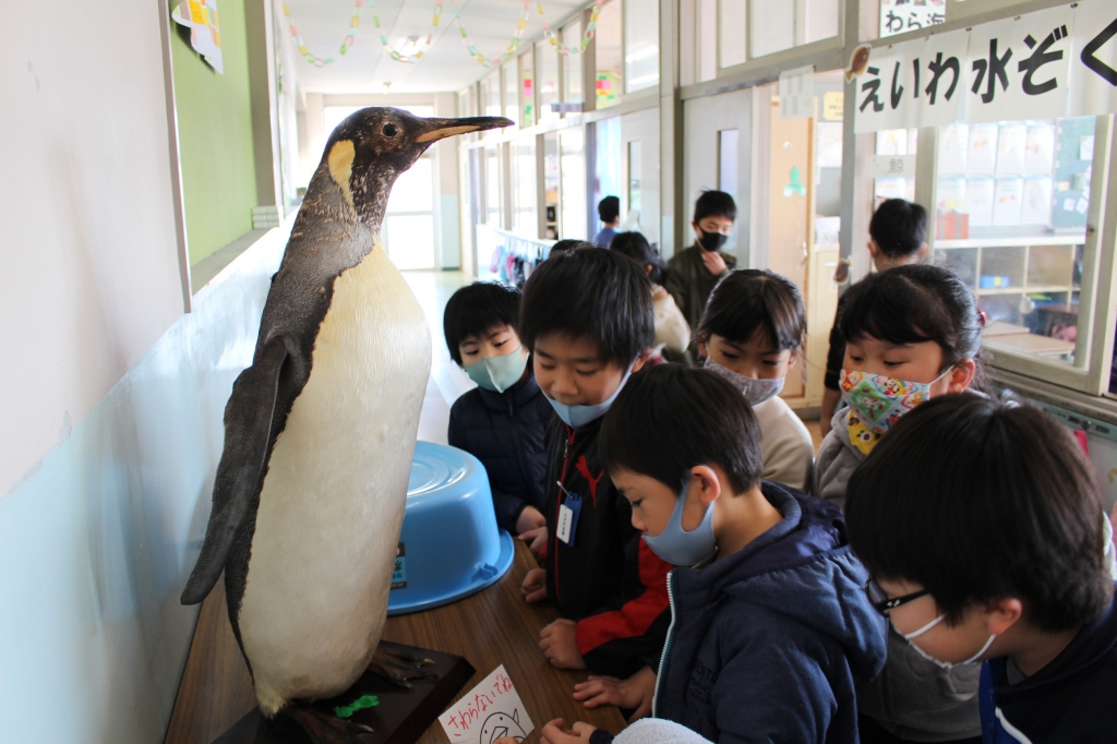 登校してきた子ども達は、飾り付けられた教室に大興奮。タコやエビ、ヒラメやフグなど、大喜びで見ていました。また、2年生の廊下には、ペンギン(剥製)もやって来て、ペンギンの毛並みやくちばしを間近で観察する子もいました。先生達も、名古屋港水族館の帽子をかぶり、着ぐるみを着て、雰囲気はまるで名古屋港水族館でした。