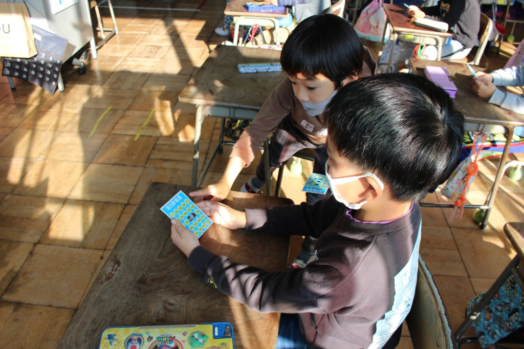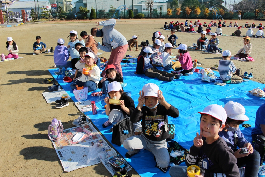 授業が始まると、なんでもバスケットをしたり、ビンゴゲームをしたりと、先生が準備したレクリエーションをして楽しみました。4時間目には1・2年生合同でドッジボールをしました。そして、楽しみにしていたお弁当は・・・運動場で食べました。風もなく、太陽がぽかぽかのやさしい日差しの中、みんなで輪になり会食。お家の方が作ってくれたお弁当は格別においしかったようで、どの子も笑顔いっぱい、お腹いっぱいのお弁当タイムでした。社会見学には行けませんでしたが、思い出に残る『永和小水族館』となりました。
